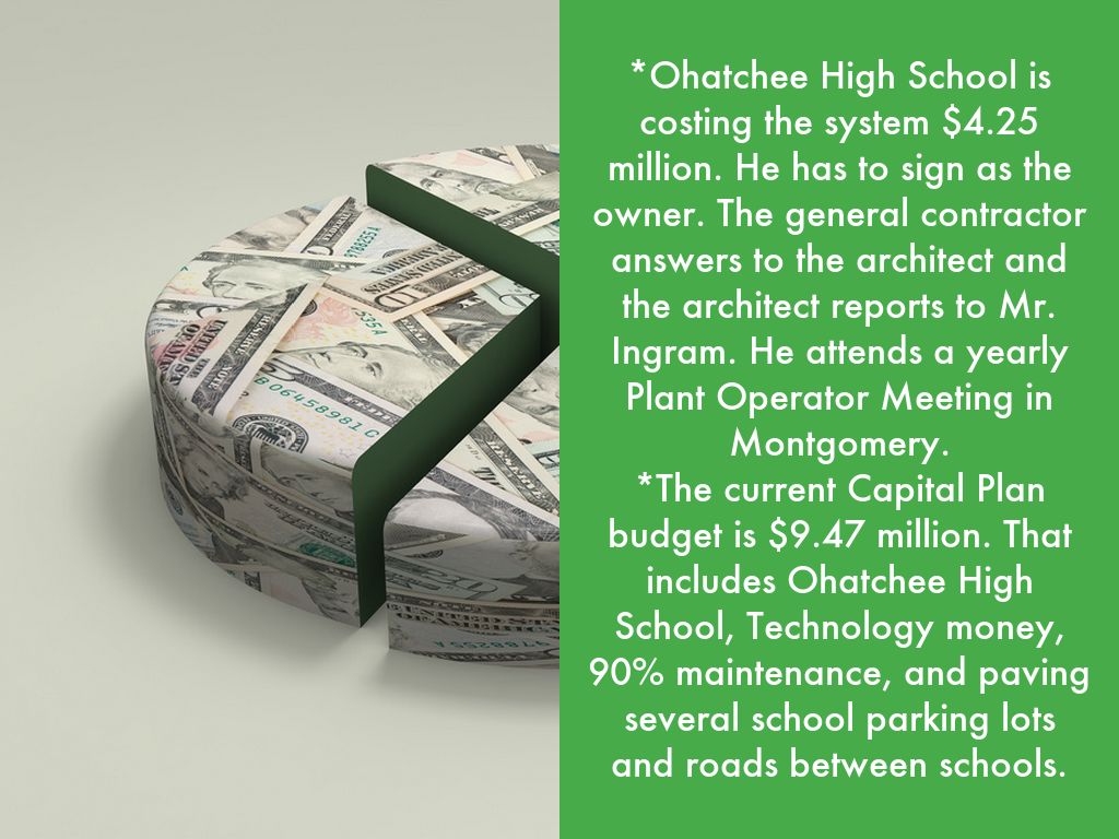 *Ohatchee High School is costing the system $4.25 million. He has to sign as the owner. The general contractor answers to the architect and the architect reports to Mr. Ingram. He attends a yearly Plant Operator Meeting in Montgomery. *The current Capital Plan budget is $9.47 million. That includes Ohatchee High School, Technology money, 90% maintenance, and paving several school parking lots and roads between schools.