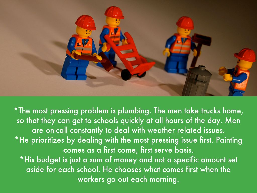*The most pressing problem is plumbing. The men take trucks home, so that they can get to schools quickly at all hours of the day. Men are on-call constantly to deal with weather related issues. *He prioritizes by dealing with the most pressing issue first. Painting comes as a first come, first serve basis. *His budget is just a sum of money and not a specific amount set aside for each school. He chooses what comes first when the workers go out each morning.