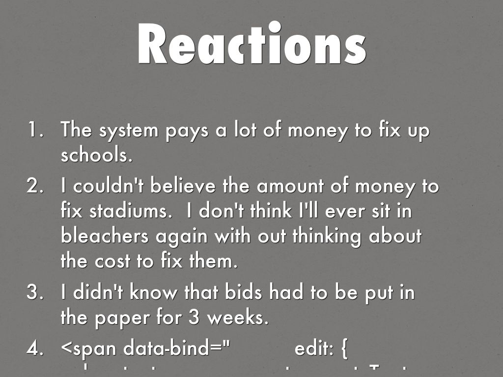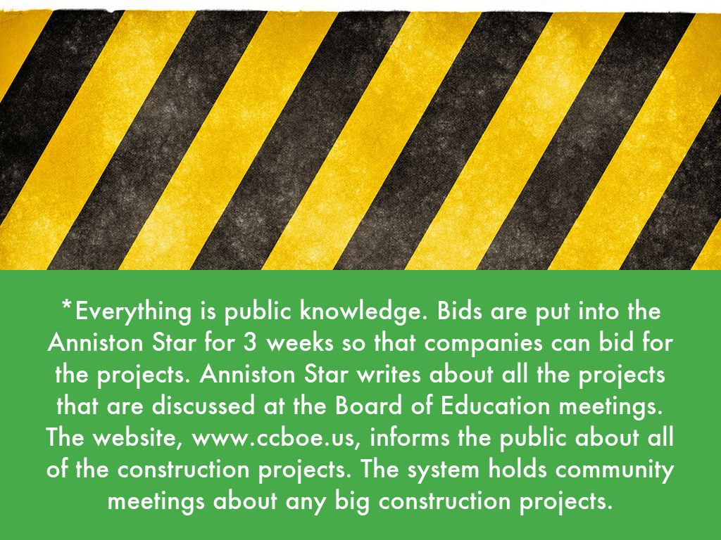 *Everything is public knowledge. Bids are put into the Anniston Star for 3 weeks so that companies can bid for the projects. Anniston Star writes about all the projects that are discussed at the Board of Education meetings. The website, www.ccboe.us, informs the public about all of the construction projects. The system holds community meetings about any big construction projects.