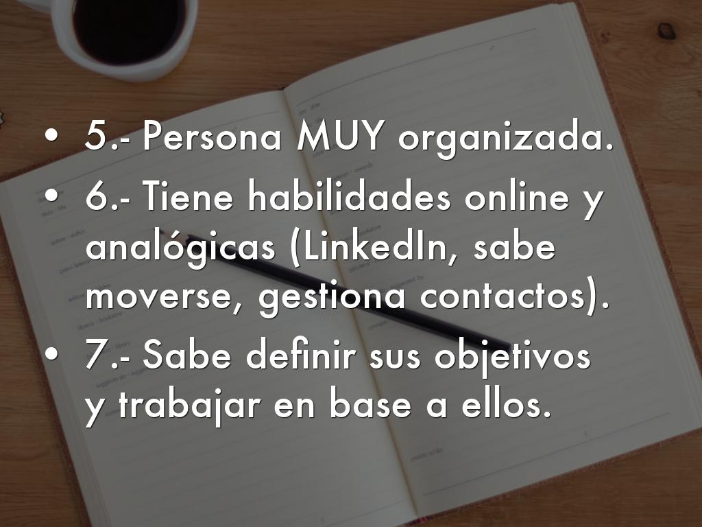 • 6.- Tiene habilidades online y analógicas (LinkedIn, sabe moverse, gestiona contactos).