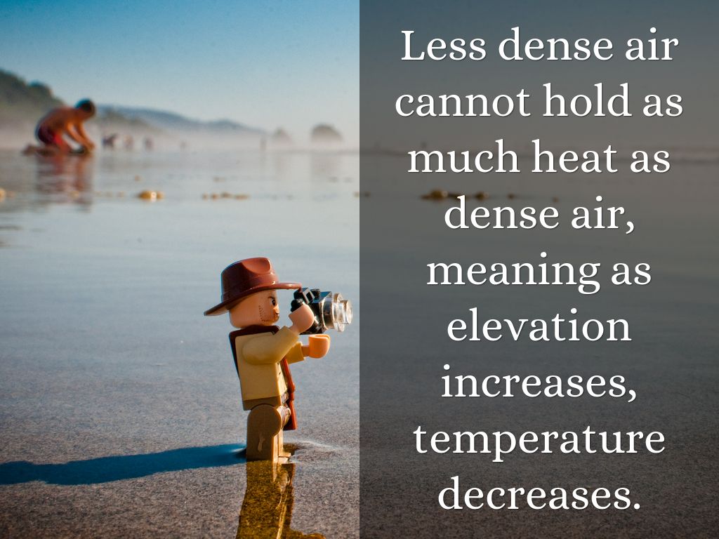 Less dense air cannot hold as much heat as dense air, meaning as elevation increases, temperature decreases.