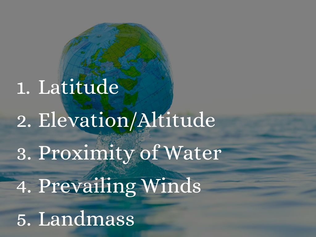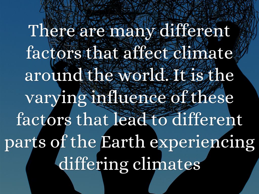 There are many different factors that affect climate around the world. It is the varying influence of these factors that lead to different parts of the Earth experiencing differing climates