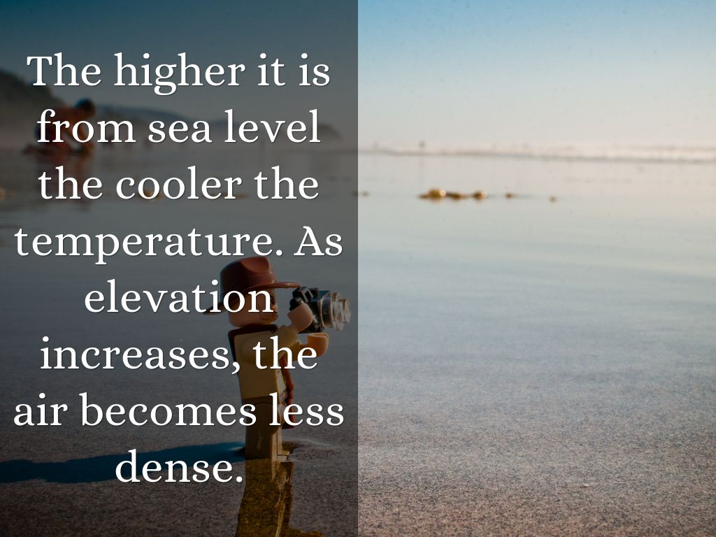 The higher it is from sea level the cooler the temperature. As elevation increases, the air becomes less dense.