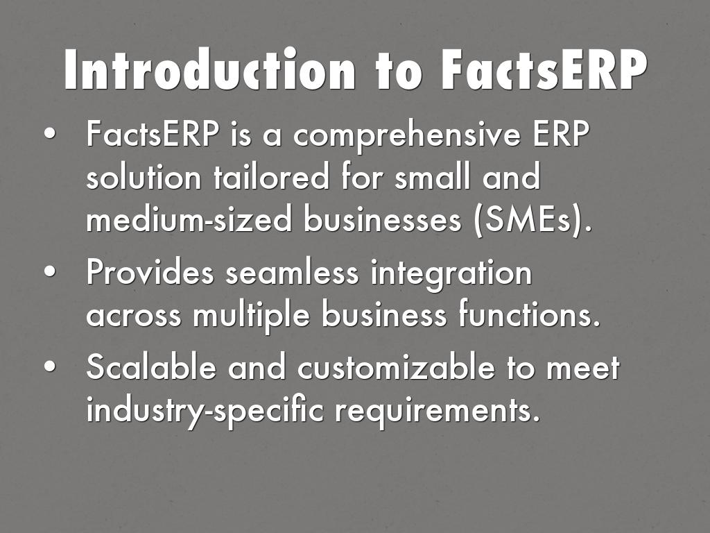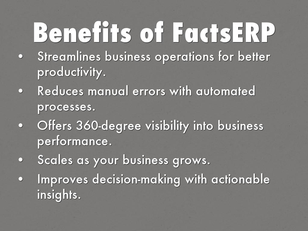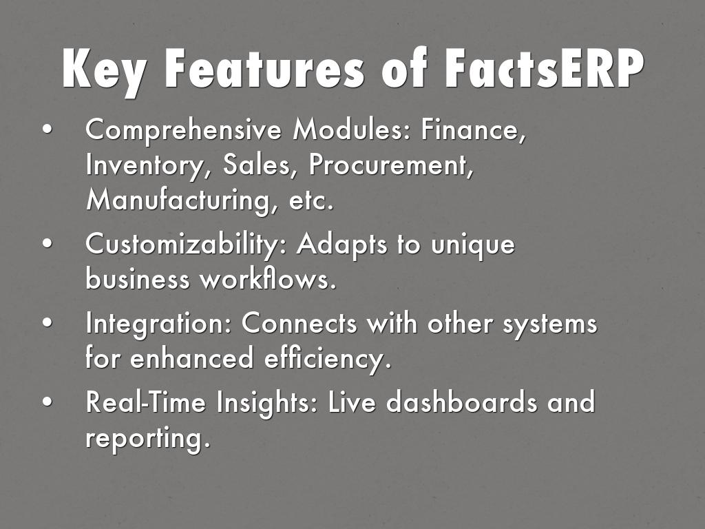 FactsERP is a cutting-edge Enterprise Resource Planning (ERP) solution specifically designed to empower small and medium-sized enterprises (SMEs) in the UAE and beyond. Developed by FACTS Computer Software House LLC, this dynamic software streamlines and automates core business processes, enhancing efficiency, productivity, and decision-making. Leading ERP Software in Dubai.