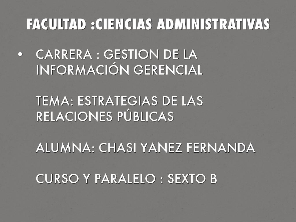 • CARRERA : GESTION DE LA INFORMACIÓN GERENCIAL TEMA: ESTRATEGIAS DE LAS RELACIONES PÚBLICAS ALUMNA: CHASI YANEZ FERNANDA CURSO Y PARALELO : SEXTO B