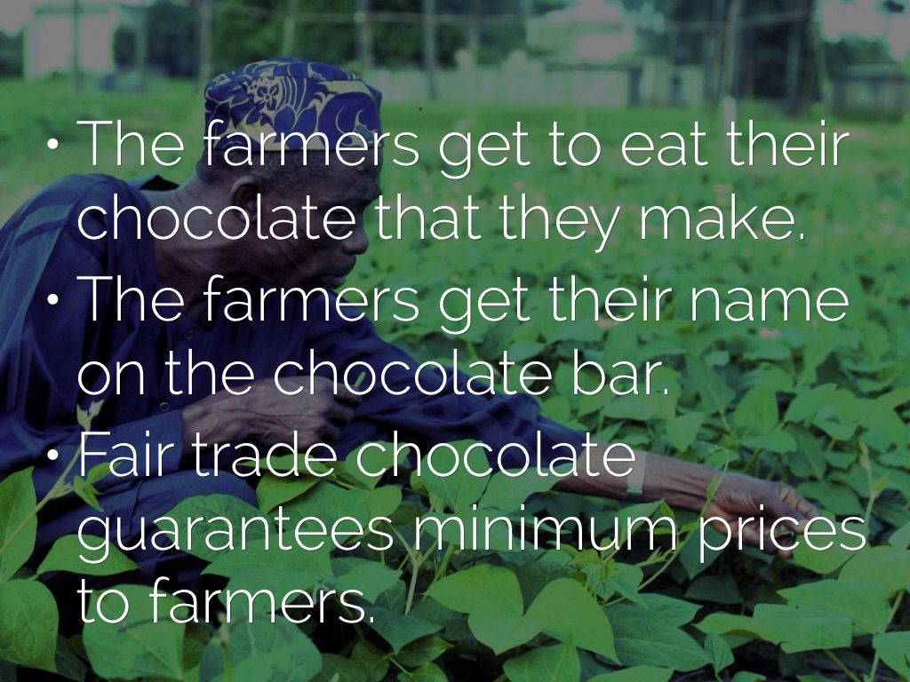 • Fair trade chocolate guarantees minimum prices to farmers.