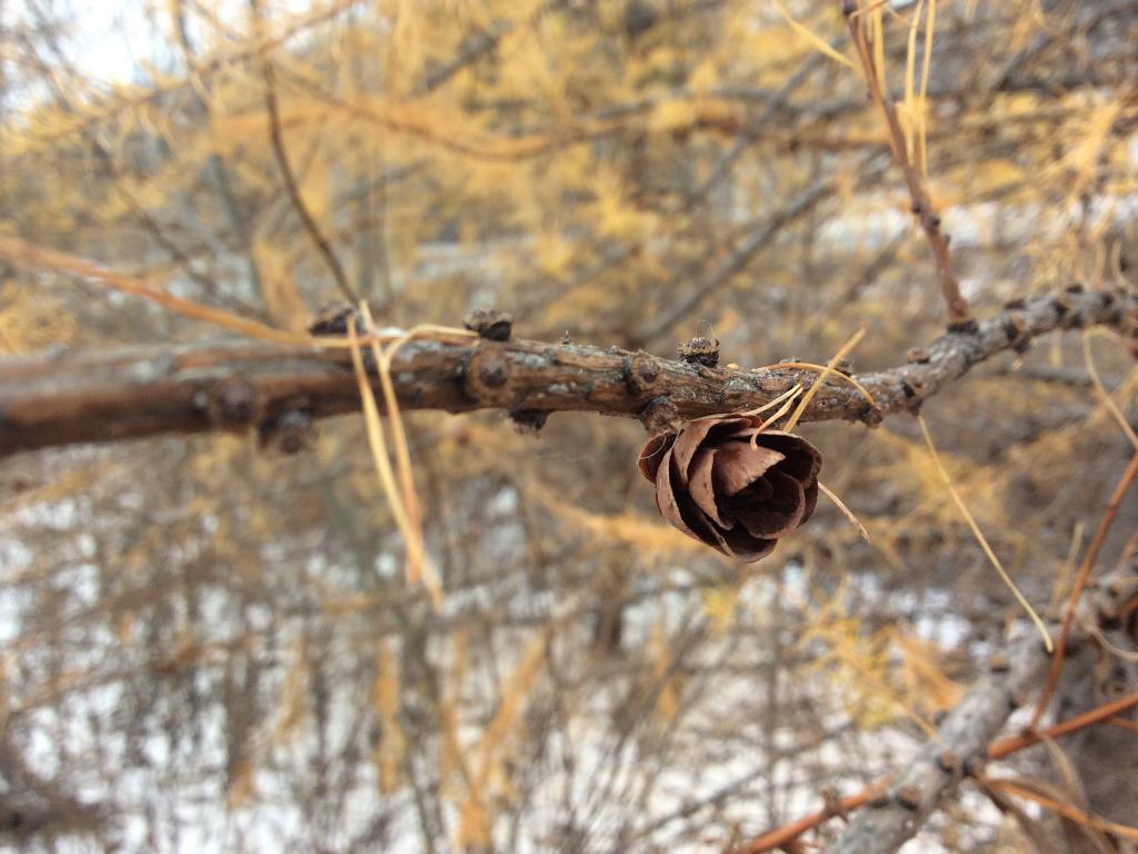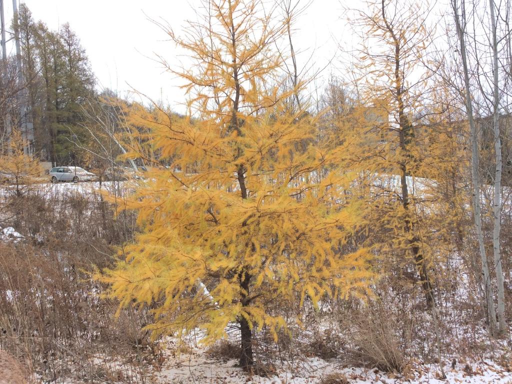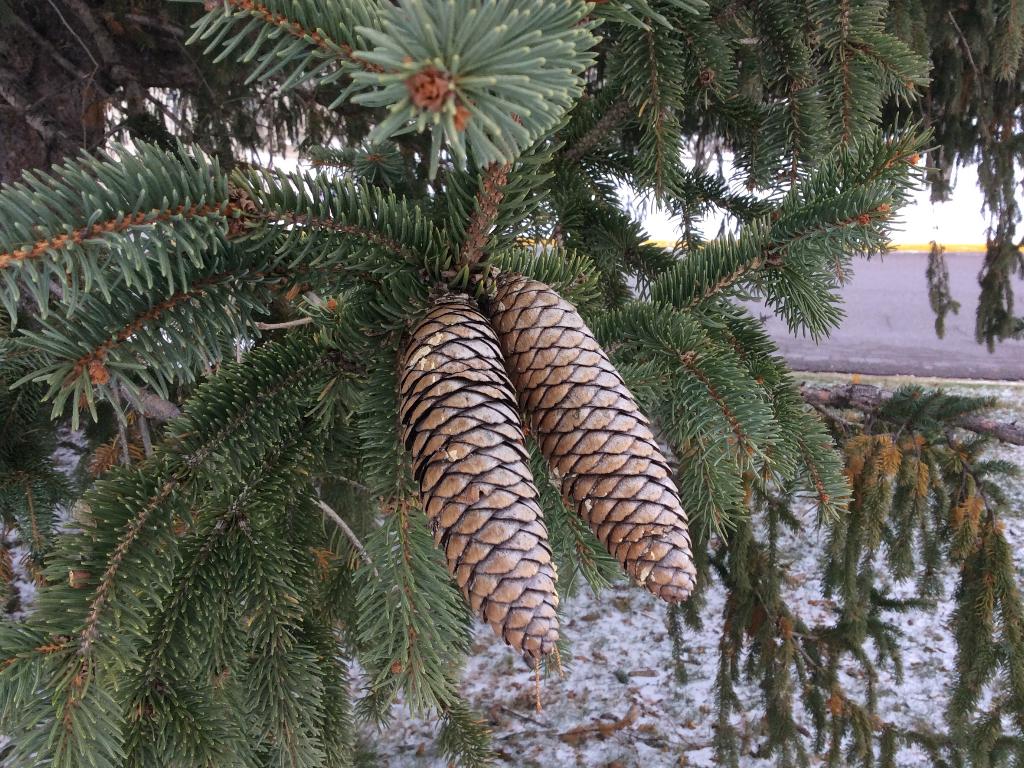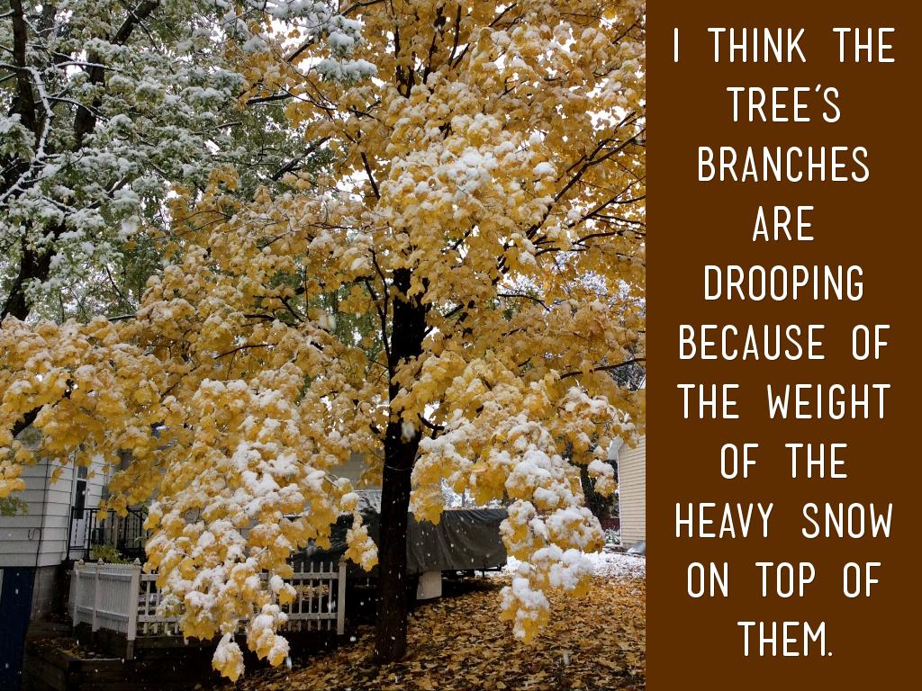 I think the tree’s branches are drooping because of the weight of the heavy snow on top of them.