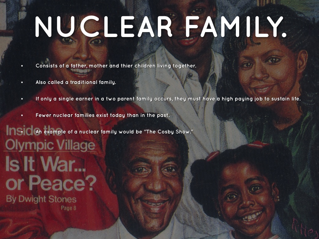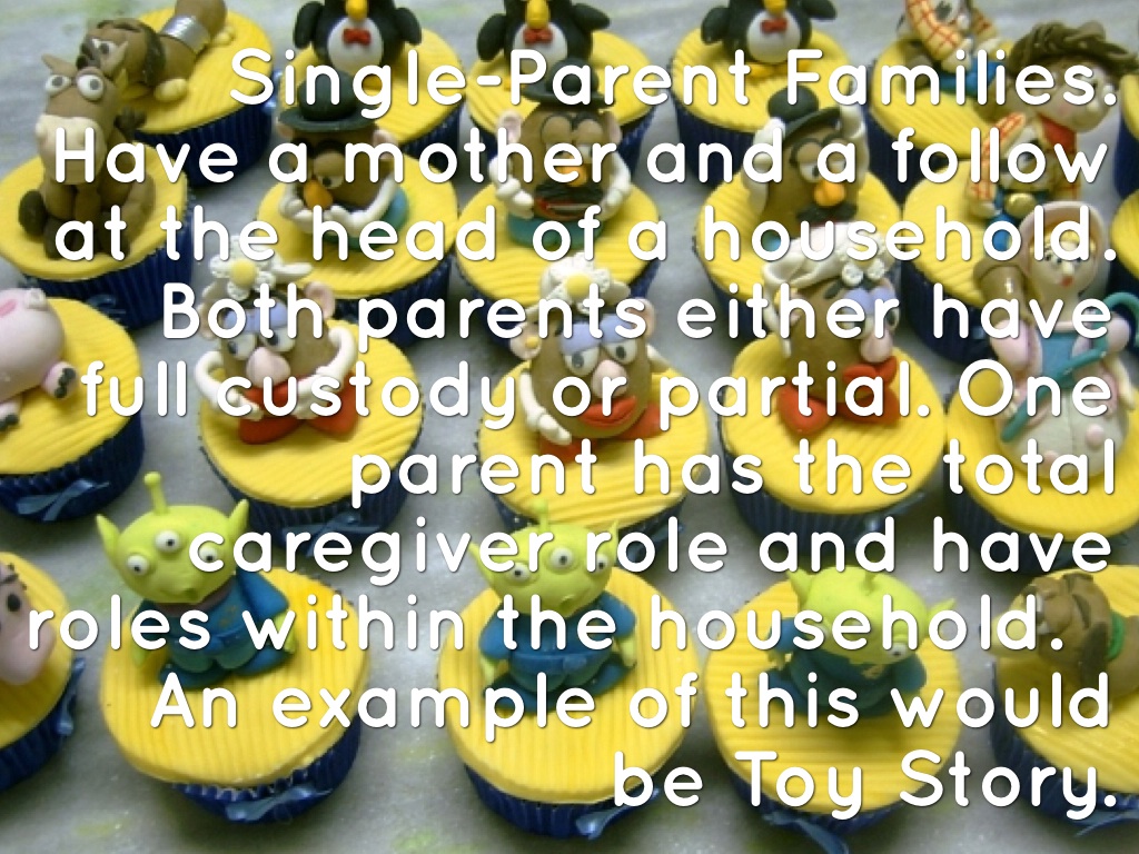 Single-Parent Families. Have a mother and a follow at the head of a household. Both parents either have full custody or partial. One parent has the total caregiver role and have roles within the household. An example of this would be Toy Story.