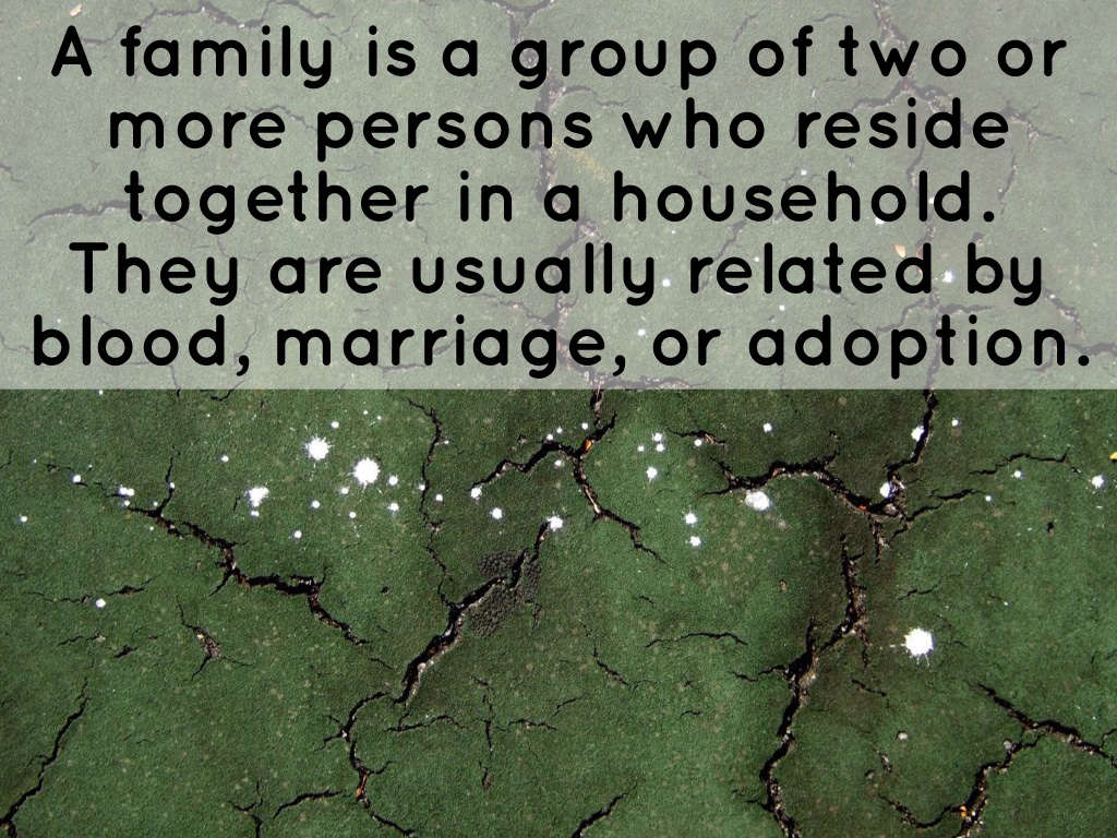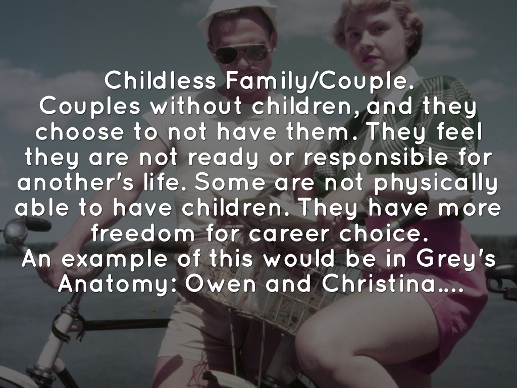 Childless Family/Couple. Couples without children, and they choose to not have them. They feel they are not ready or responsible for another's life. Some are not physically able to have children. They have more freedom for career choice. An example of this would be in Grey's Anatomy: Owen and Christina.