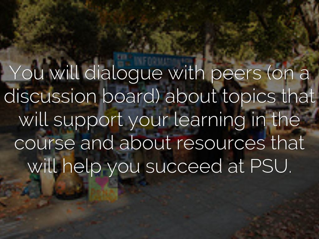 You will dialogue with peers (on a discussion board) about topics that will support your learning in the course and about resources that will help you succeed at PSU.