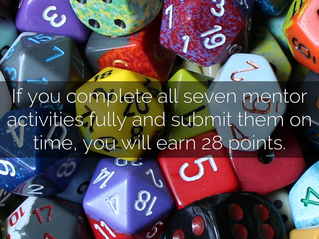 If you complete all seven mentor activities fully and submit them on time, you will earn 28 points.
