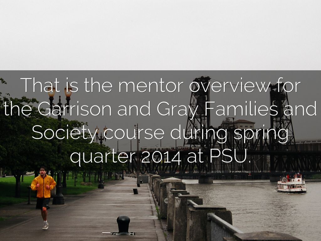 That is the mentor overview for the Garrison and Gray Families and Society course during spring quarter 2014 at PSU.