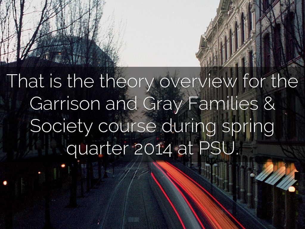 That is the theory overview for the Garrison and Gray Families & Society course during spring quarter 2014 at PSU.