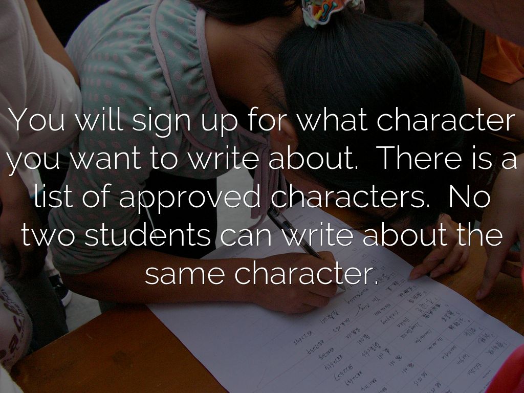 You will sign up for what character you want to write about. There is a list of approved characters. No two students can write about the same character.