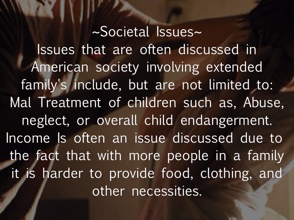 Issues that are often discussed in American society involving extended family's include, but are not limited to: