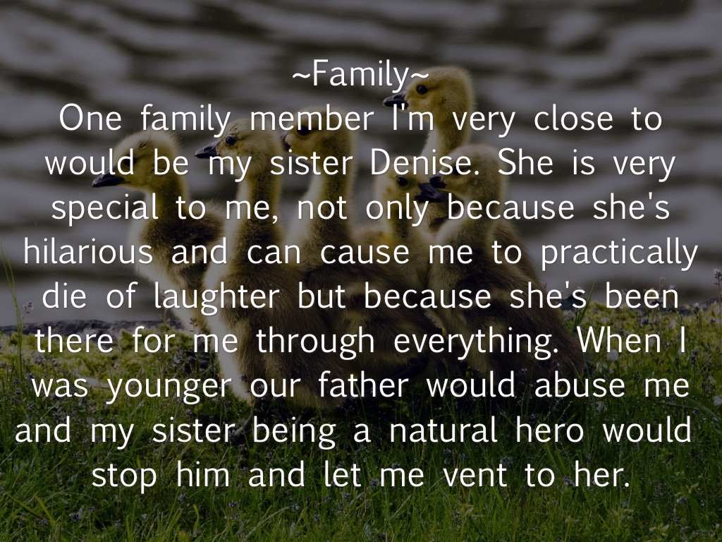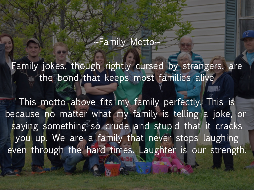 This motto above fits my family perfectly. This is because no matter what my family is telling a joke, or saying something so crude and stupid that it cracks you up. We are a family that never stops laughing even through the hard times. Laughter is our strength.