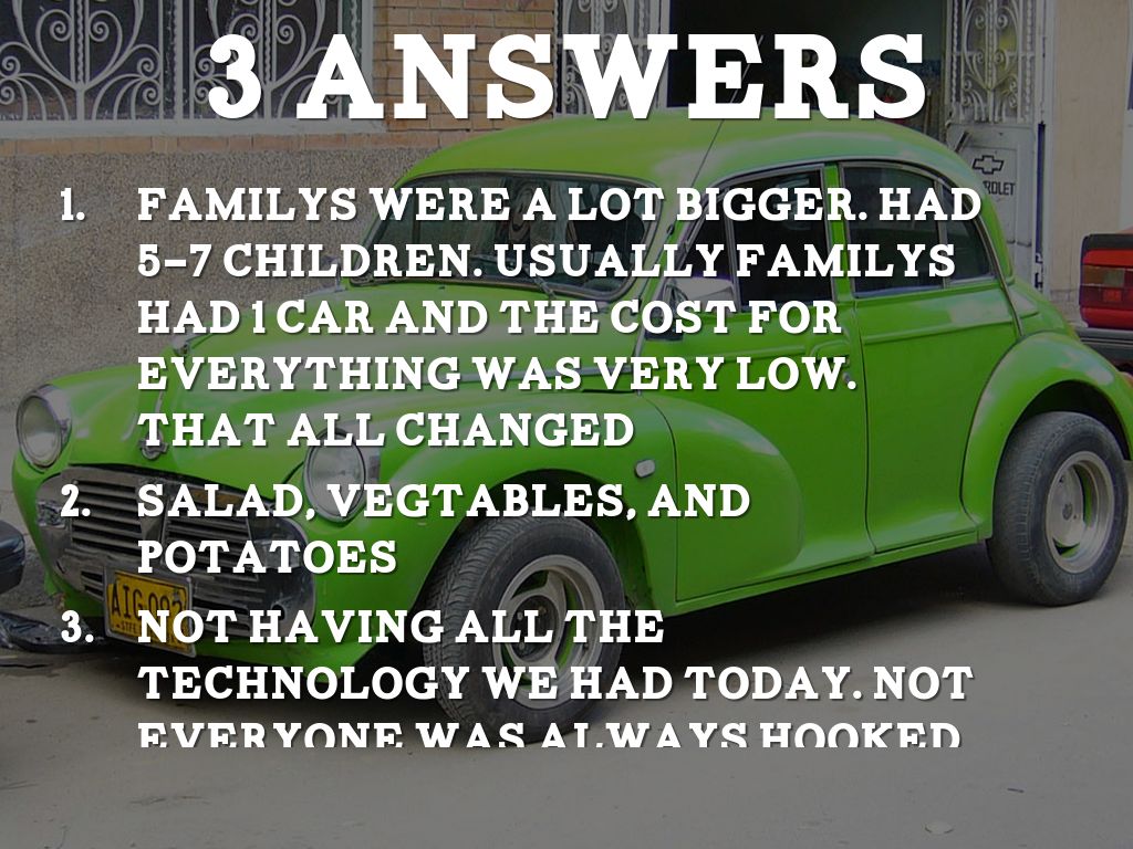 Familys were a lot bigger. Had 5-7 children. Usually familys had 1 car and the cost for everything was very low. That all changed