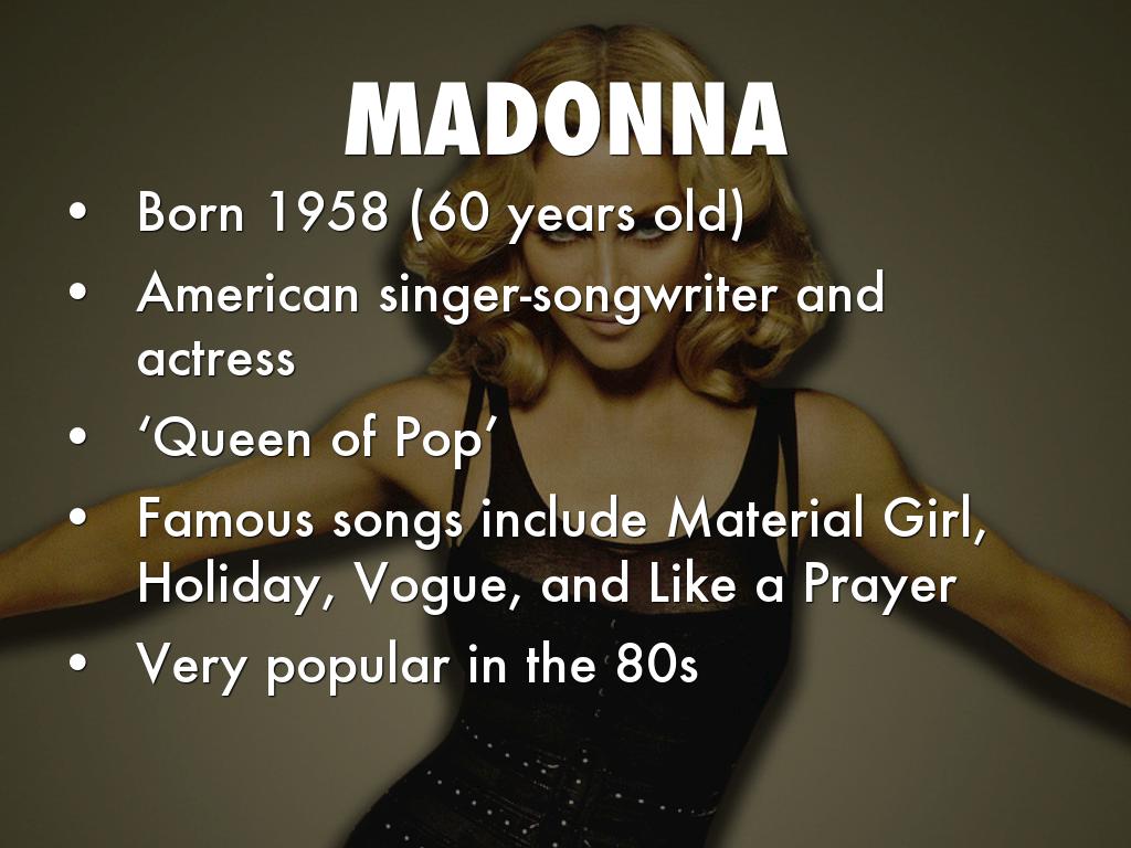 Famous songs include Material Girl, Holiday, Vogue, and Like a Prayer