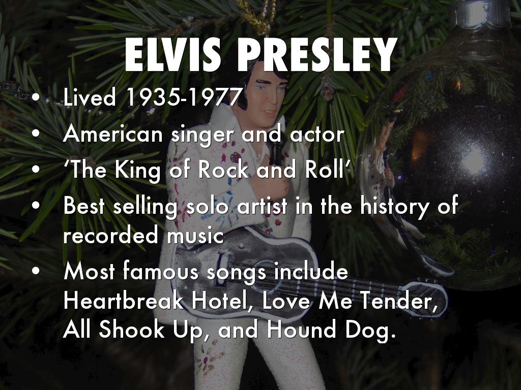 Most famous songs include Heartbreak Hotel, Love Me Tender, All Shook Up, and Hound Dog.