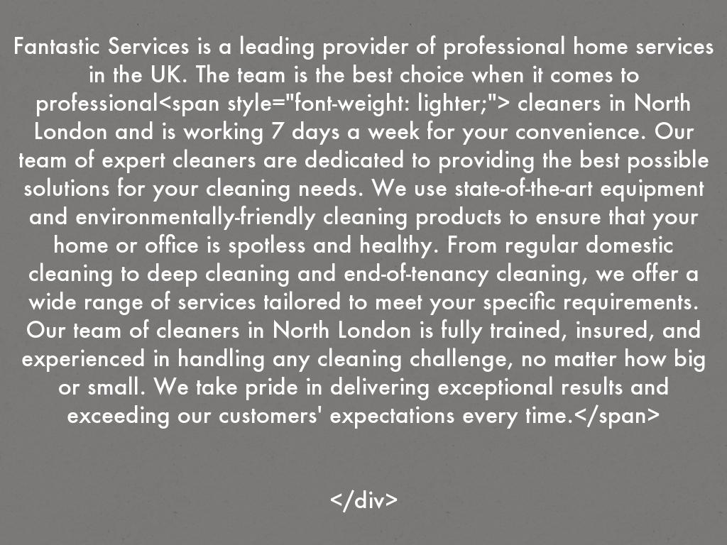 Fantastic Services is a leading provider of professional home services in the UK. The team is the best choice when it comes to professional cleaners in North London and is working 7 days a week for your convenience. Our team of expert cleaners are dedicated to providing the best possible solutions for your cleaning needs. We use state-of-the-art equipment and environmentally-friendly cleaning products to ensure that your home or office is spotless and healthy. From regular domestic cleaning to deep cleaning and end-of-tenancy cleaning, we offer a wide range of services tailored to meet your specific requirements. Our team of cleaners in North London is fully trained, insured, and experienced in handling any cleaning challenge, no matter how big or small. We take pride in delivering exceptional results and exceeding our customers' expectations every time.