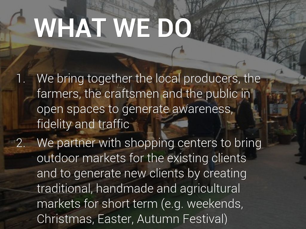 • We partner with shopping centers to bring outdoor markets for the existing clients and to generate new clients by creating traditional, handmade and agricultural markets for short term (e.g. weekends, Christmas, Easter, Autumn Festival)