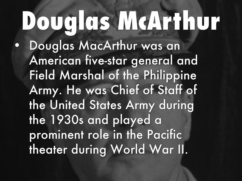 Douglas MacArthur was an American five-star general and Field Marshal of the Philippine Army. He was Chief of Staff of the United States Army during the 1930s and played a prominent role in the Pacific theater during World War II.