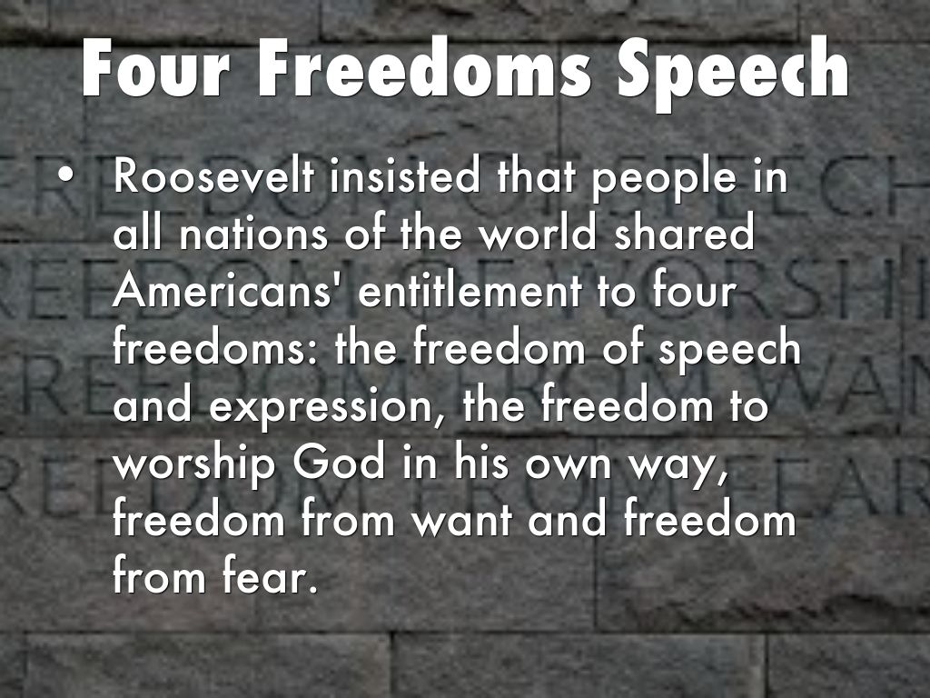 Roosevelt insisted that people in all nations of the world shared Americans' entitlement to four freedoms: the freedom of speech and expression, the freedom to worship God in his own way, freedom from want and freedom from fear.