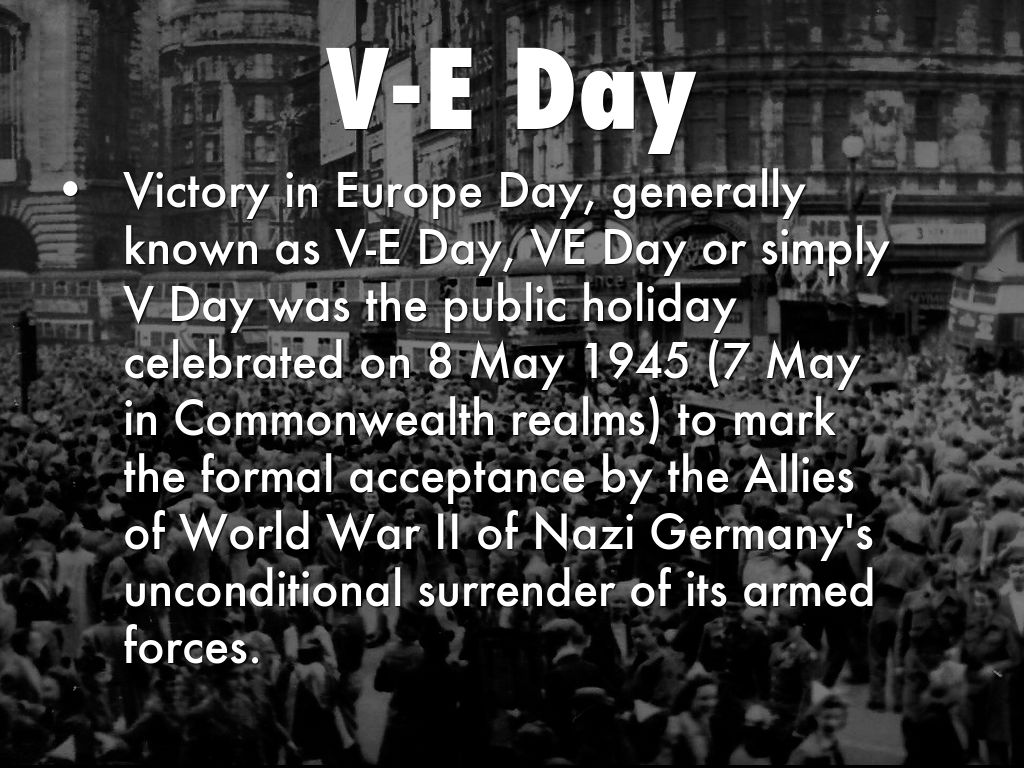 Victory in Europe Day, generally known as V-E Day, VE Day or simply V Day was the public holiday celebrated on 8 May 1945 (7 May in Commonwealth realms) to mark the formal acceptance by the Allies of World War II of Nazi Germany's unconditional surrender of its armed forces.
