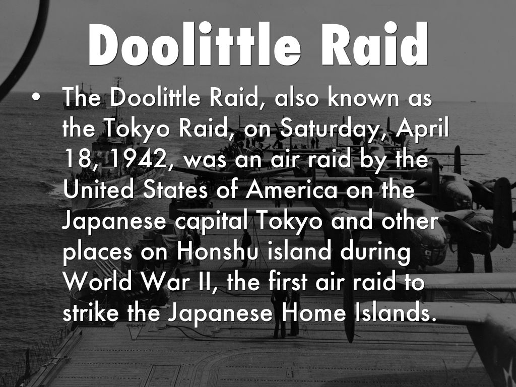The Doolittle Raid, also known as the Tokyo Raid, on Saturday, April 18, 1942, was an air raid by the United States of America on the Japanese capital Tokyo and other places on Honshu island during World War II, the first air raid to strike the Japanese Home Islands.
