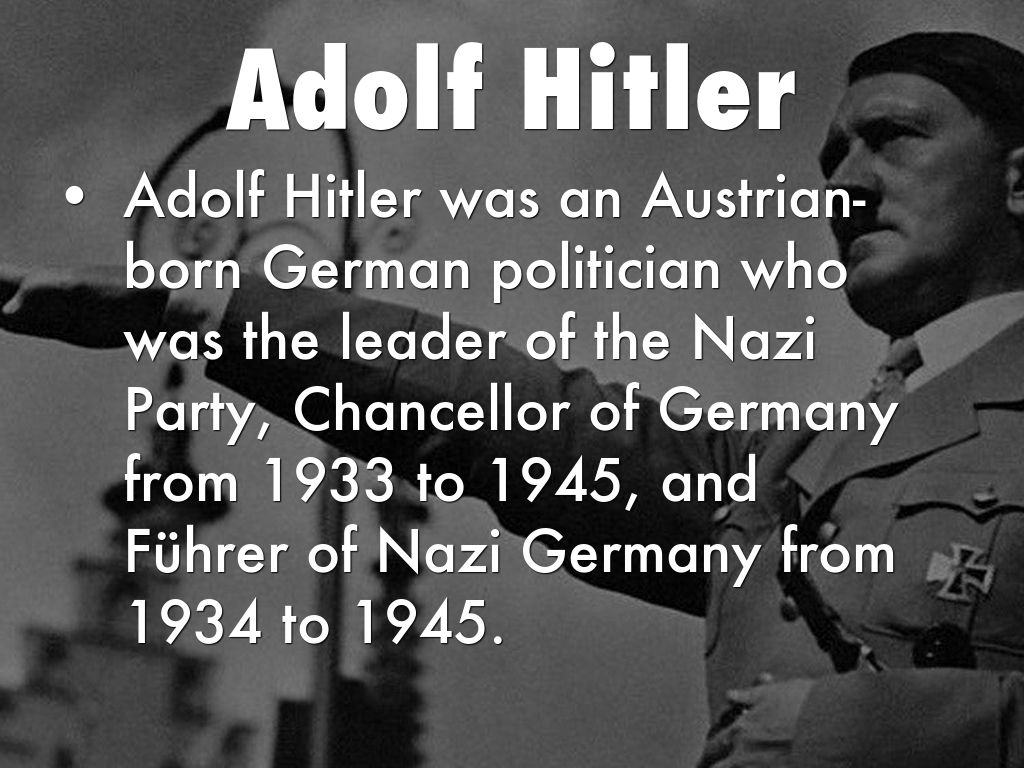 Adolf Hitler was an Austrian-born German politician who was the leader of the Nazi Party, Chancellor of Germany from 1933 to 1945, and Führer of Nazi Germany from 1934 to 1945.