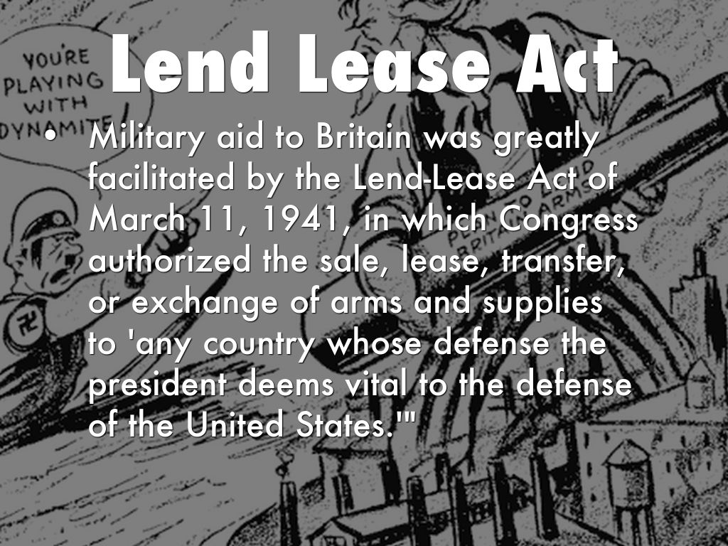 Military aid to Britain was greatly facilitated by the Lend-Lease Act of March 11, 1941, in which Congress authorized the sale, lease, transfer, or exchange of arms and supplies to 'any country whose defense the president deems vital to the defense of the United States.'"
