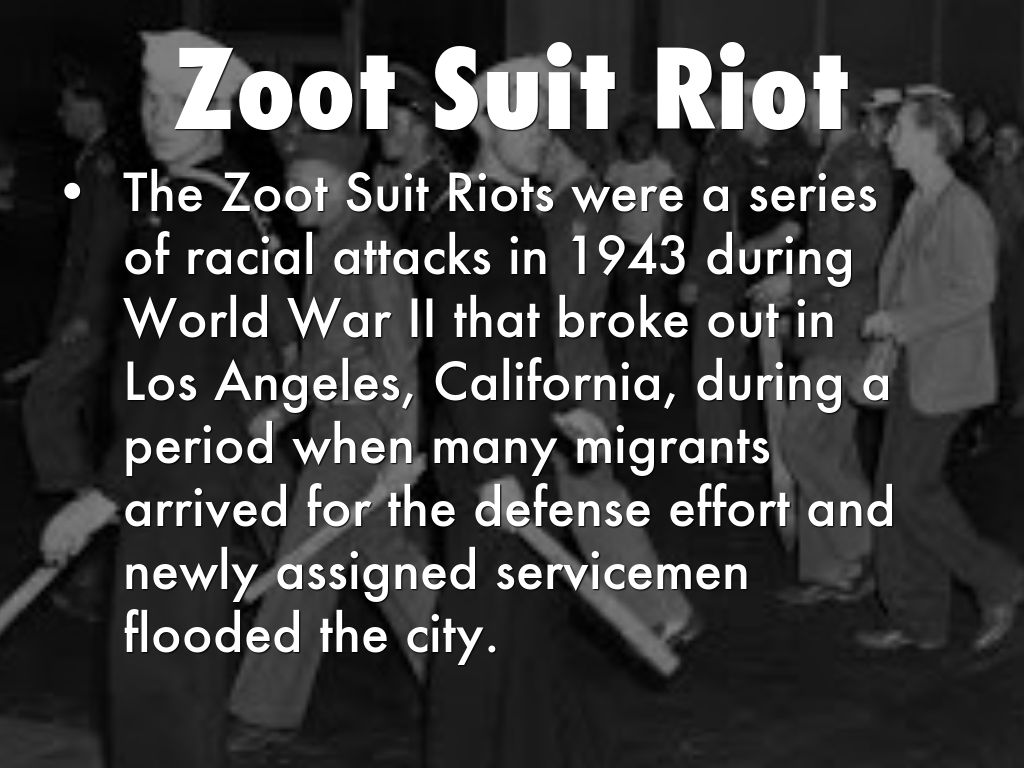 The Zoot Suit Riots were a series of racial attacks in 1943 during World War II that broke out in Los Angeles, California, during a period when many migrants arrived for the defense effort and newly assigned servicemen flooded the city.
