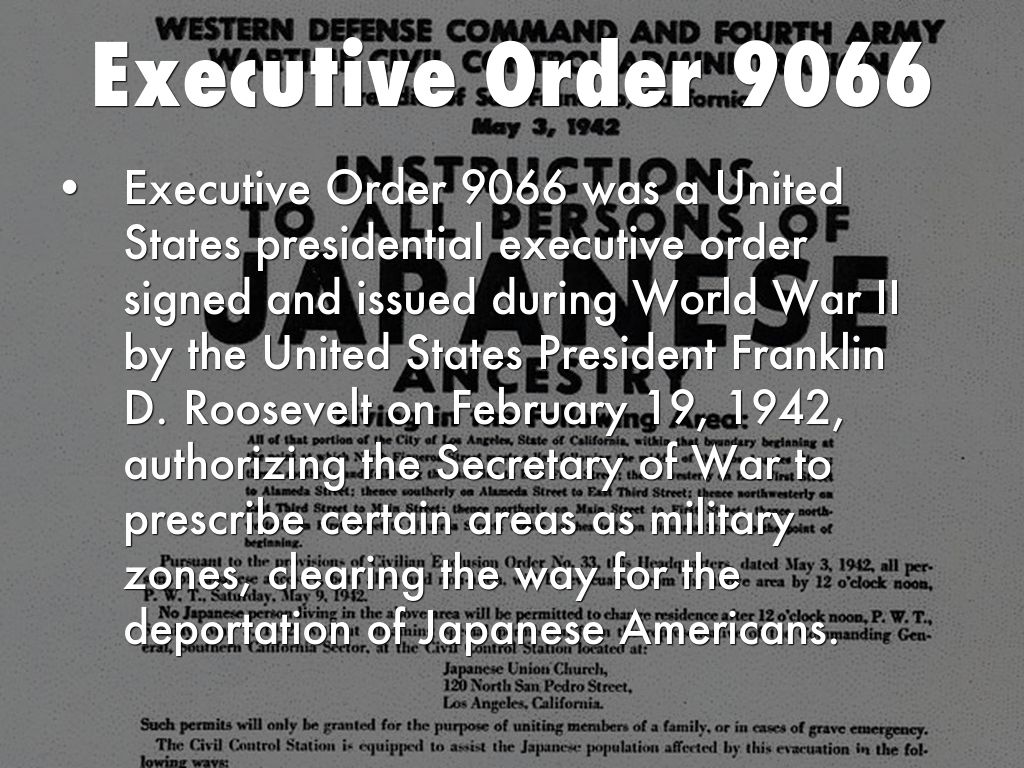 Executive Order 9066 was a United States presidential executive order signed and issued during World War II by the United States President Franklin D. Roosevelt on February 19, 1942, authorizing the Secretary of War to prescribe certain areas as military zones, clearing the way for the deportation of Japanese Americans.