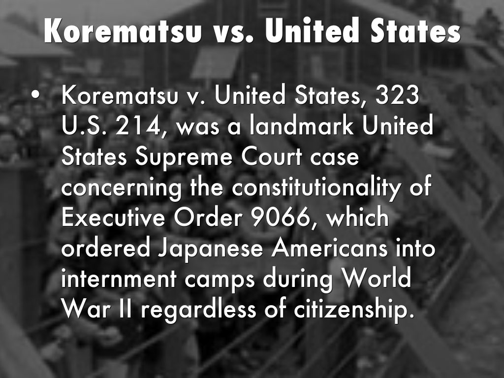 Korematsu v. United States, 323 U.S. 214, was a landmark United States Supreme Court case concerning the constitutionality of Executive Order 9066, which ordered Japanese Americans into internment camps during World War II regardless of citizenship.