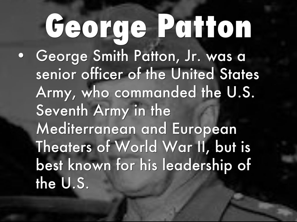 George Smith Patton, Jr. was a senior officer of the United States Army, who commanded the U.S. Seventh Army in the Mediterranean and European Theaters of World War II, but is best known for his leadership of the U.S.