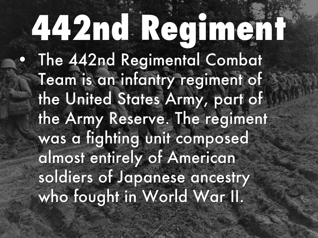 The 442nd Regimental Combat Team is an infantry regiment of the United States Army, part of the Army Reserve. The regiment was a fighting unit composed almost entirely of American soldiers of Japanese ancestry who fought in World War II.