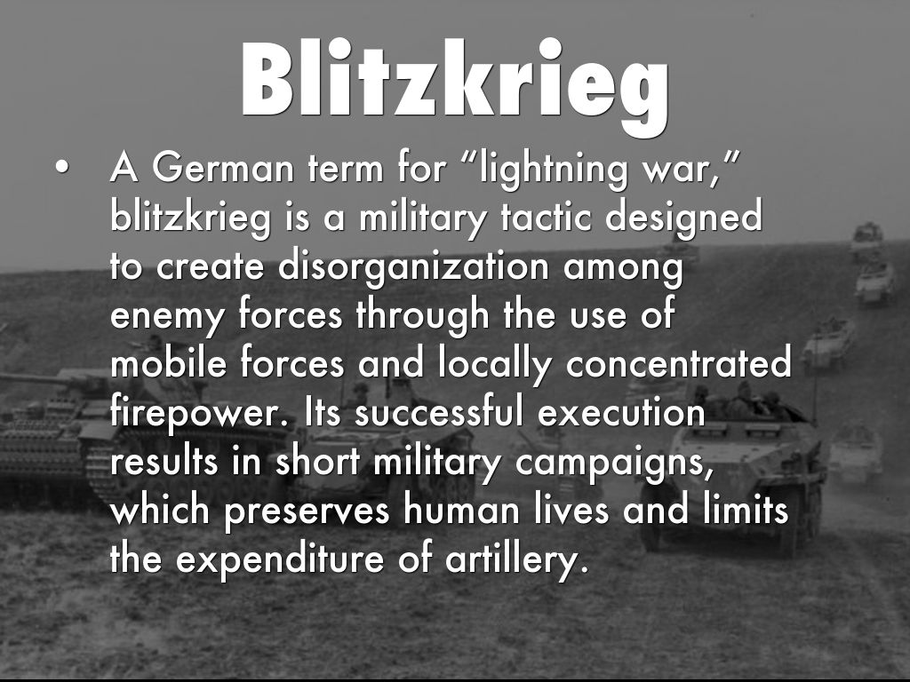 A German term for “lightning war,” blitzkrieg is a military tactic designed to create disorganization among enemy forces through the use of mobile forces and locally concentrated firepower. Its successful execution results in short military campaigns, which preserves human lives and limits the expenditure of artillery.