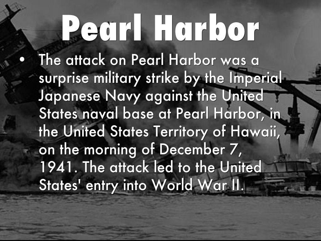 The attack on Pearl Harbor was a surprise military strike by the Imperial Japanese Navy against the United States naval base at Pearl Harbor, in the United States Territory of Hawaii, on the morning of December 7, 1941. The attack led to the United States' entry into World War II.