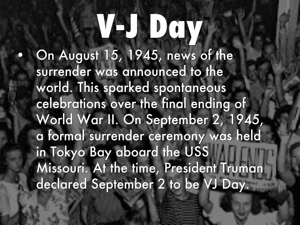 On August 15, 1945, news of the surrender was announced to the world. This sparked spontaneous celebrations over the final ending of World War II. On September 2, 1945, a formal surrender ceremony was held in Tokyo Bay aboard the USS Missouri. At the time, President Truman declared September 2 to be VJ Day.