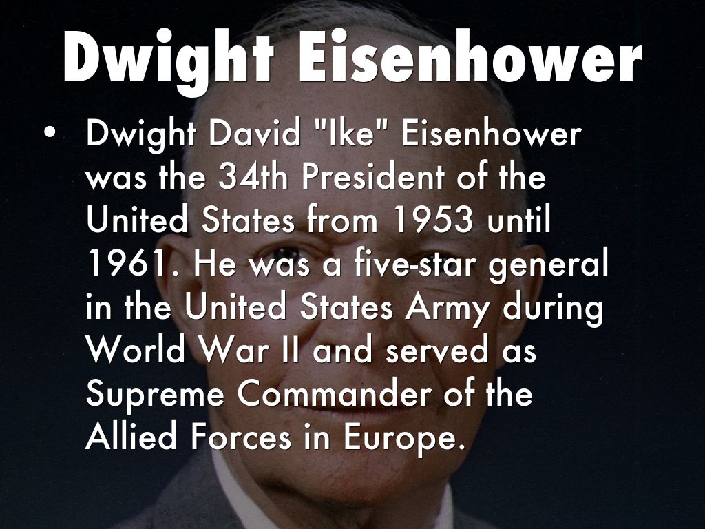Dwight David "Ike" Eisenhower was the 34th President of the United States from 1953 until 1961. He was a five-star general in the United States Army during World War II and served as Supreme Commander of the Allied Forces in Europe.