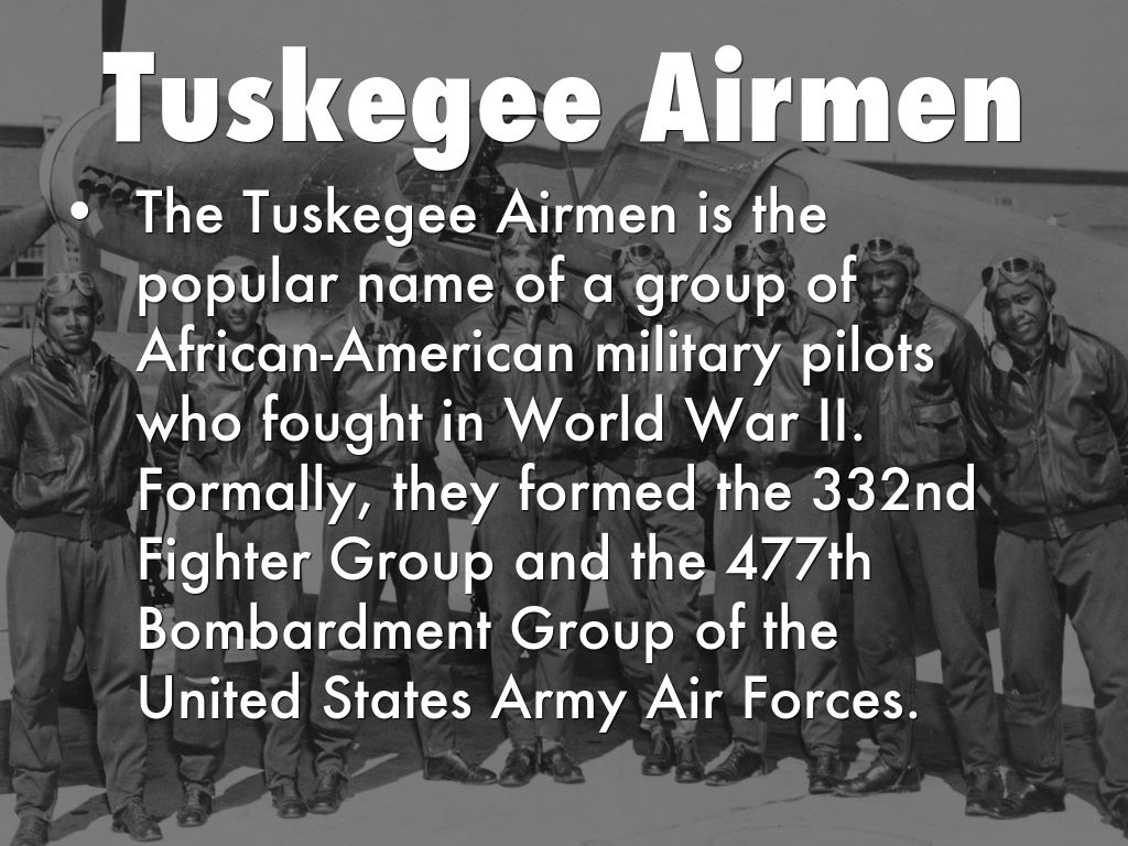 The Tuskegee Airmen is the popular name of a group of African-American military pilots who fought in World War II. Formally, they formed the 332nd Fighter Group and the 477th Bombardment Group of the United States Army Air Forces.