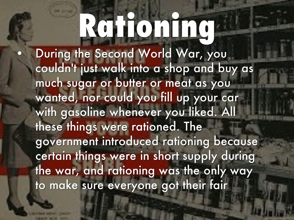 During the Second World War, you couldn't just walk into a shop and buy as much sugar or butter or meat as you wanted, nor could you fill up your car with gasoline whenever you liked. All these things were rationed. The government introduced rationing because certain things were in short supply during the war, and rationing was the only way to make sure everyone got their fair share.