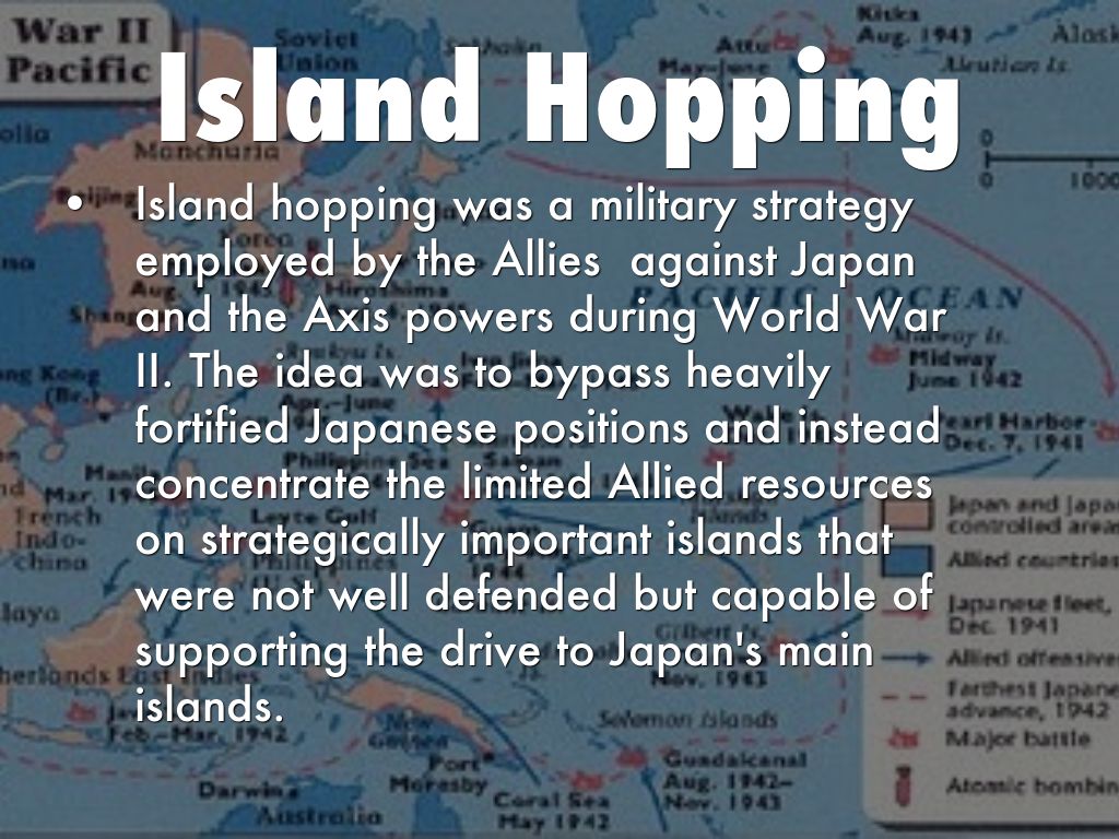Island hopping was a military strategy employed by the Allies against Japan and the Axis powers during World War II. The idea was to bypass heavily fortified Japanese positions and instead concentrate the limited Allied resources on strategically important islands that were not well defended but capable of supporting the drive to Japan's main islands.