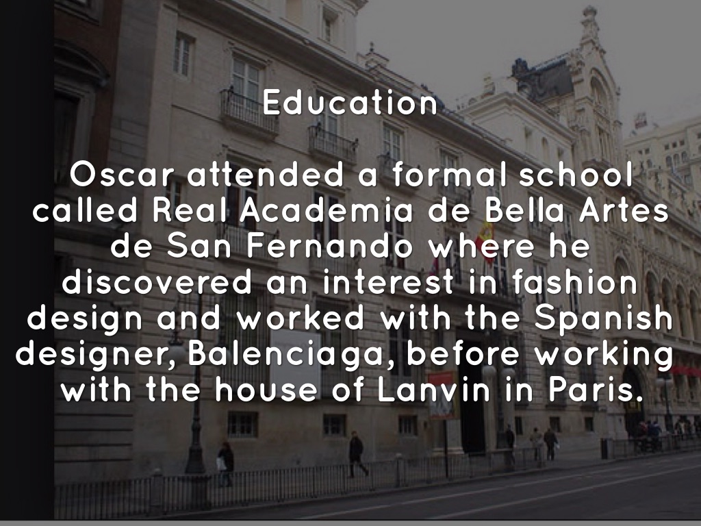 Oscar attended a formal school called Real Academia de Bella Artes de San Fernando where he discovered an interest in fashion design and worked with the Spanish designer, Balenciaga, before working with the house of Lanvin in Paris.
