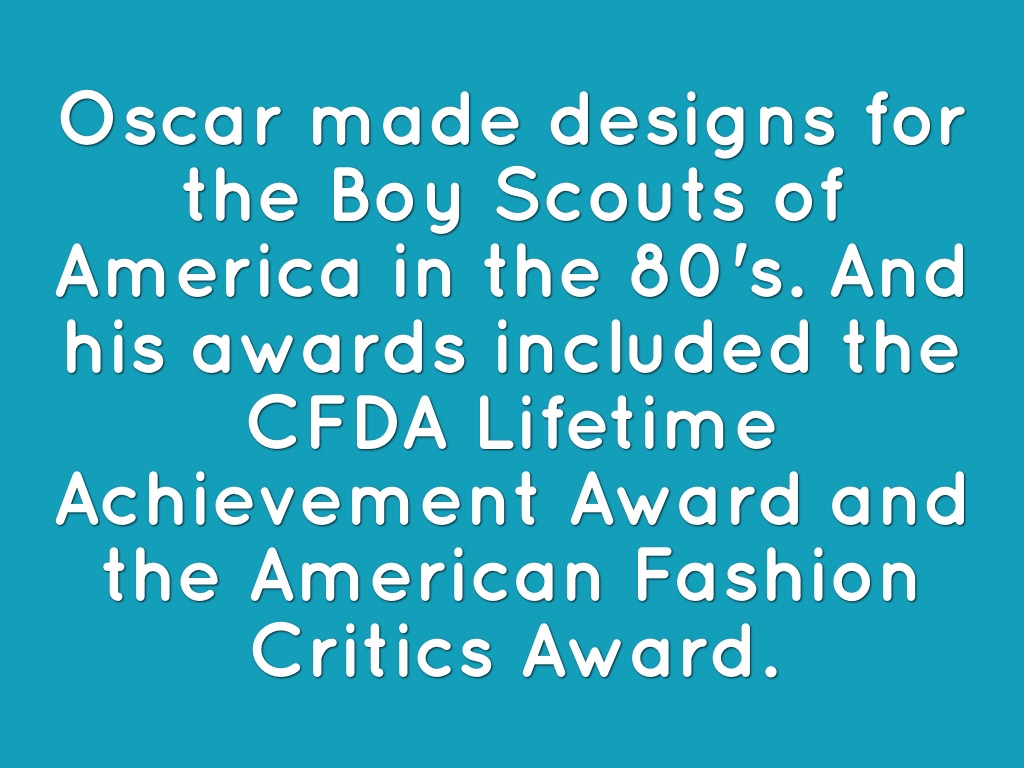 Oscar made designs for the Boy Scouts of America in the 80's. And his awards included the CFDA Lifetime Achievement Award and the American Fashion Critics Award.