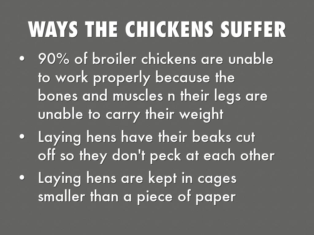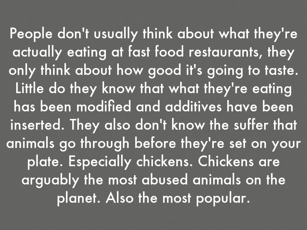 People don't usually think about what they're actually eating at fast food restaurants, they only think about how good it's going to taste. Little do they know that what they're eating has been modified and additives have been inserted. They also don't know the suffer that animals go through before they're set on your plate. Especially chickens. Chickens are arguably the most abused animals on the planet. Also the most popular.