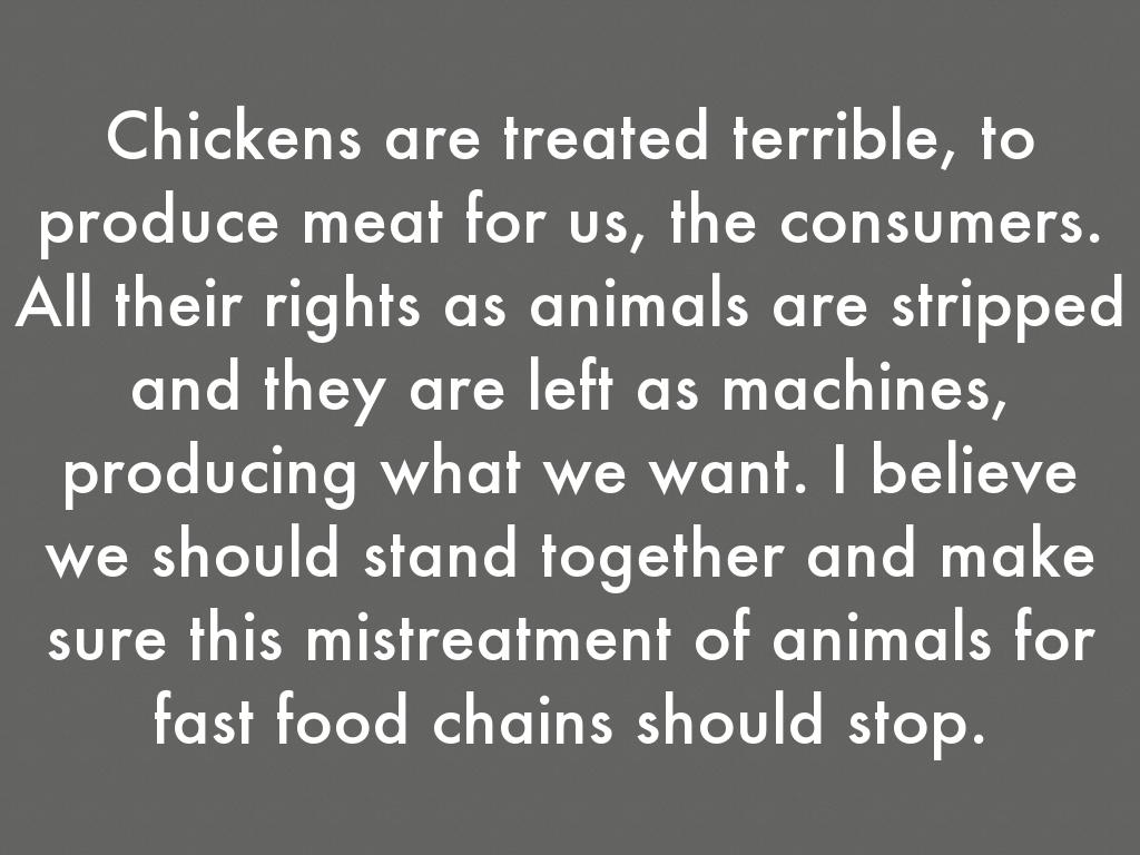 Chickens are treated terrible, to produce meat for us, the consumers. All their rights as animals are stripped and they are left as machines, producing what we want. I believe we should stand together and make sure this mistreatment of animals for fast food chains should stop.