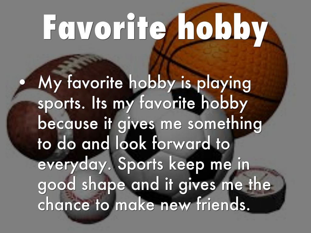 My favorite hobby is playing sports. Its my favorite hobby because it gives me something to do and look forward to everyday. Sports keep me in good shape and it gives me the chance to make new friends.