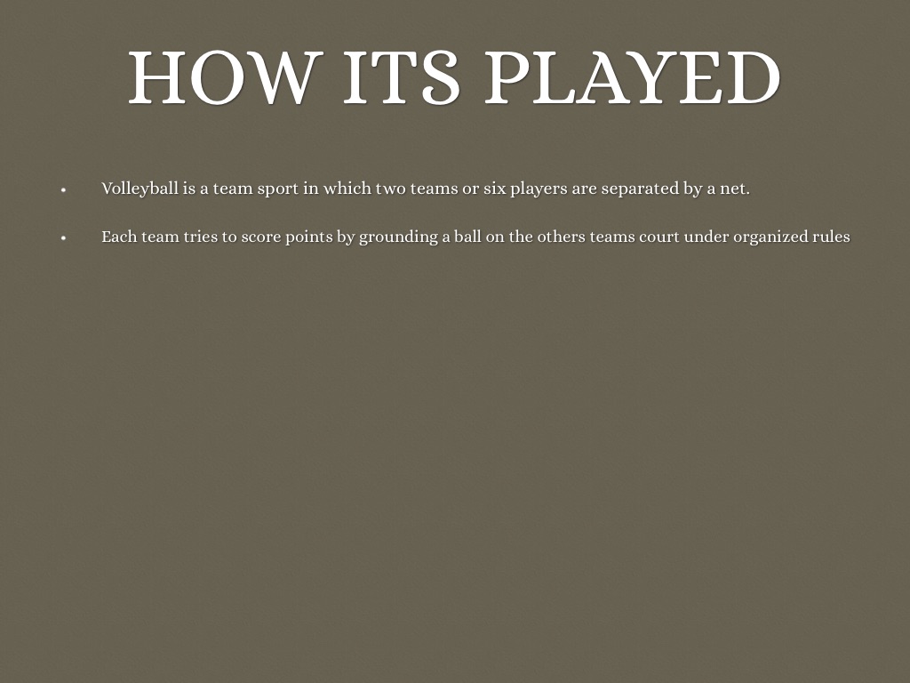 Each team tries to score points by grounding a ball on the others teams court under organized rules