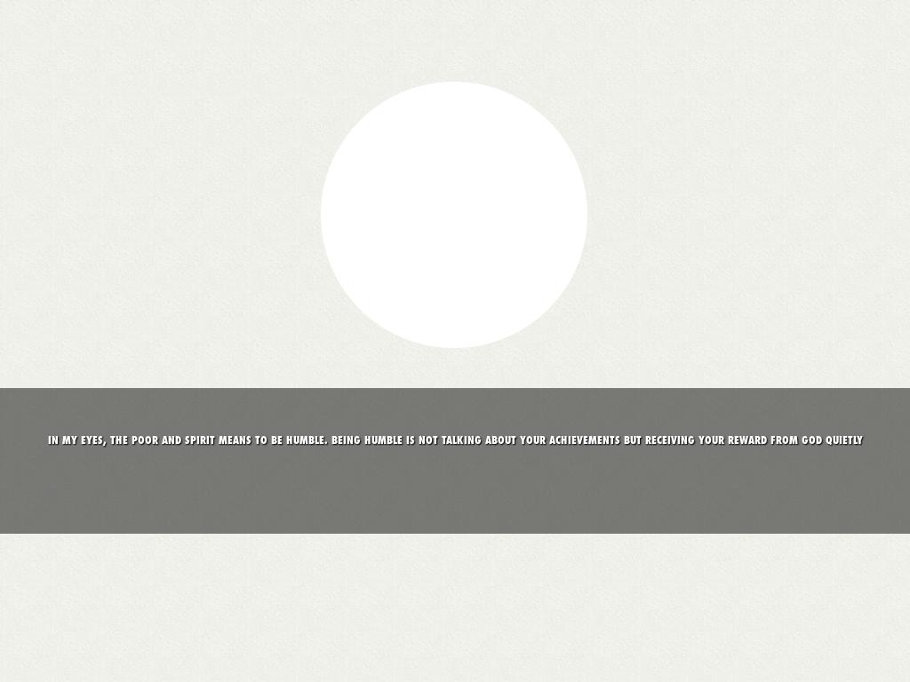 IN MY EYES, THE POOR AND SPIRIT MEANS TO BE HUMBLE. BEING HUMBLE IS NOT TALKING ABOUT YOUR ACHIEVEMENTS BUT RECEIVING YOUR REWARD FROM GOD QUIETLY